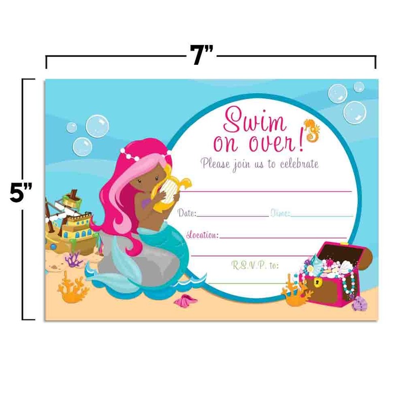 Mermaid Birthday Party Invitations, 20 5"x7" Fill In Cards with Twenty White Envelopes by AmandaCreation, Mermaid with Dark Complexion