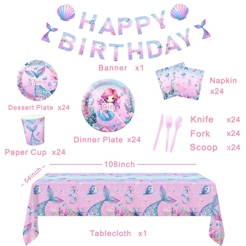 Mermaid Theme Birthday Decorations for Girls - 170PCS Party Set with Plates, Cups, Cutlery Set, Happy Birthday Banner, Tablecloth, and Napkins - Perfect for Ocean and Under the Sea Party Decorations