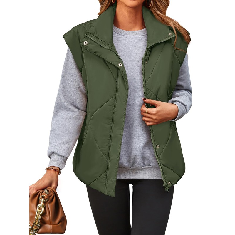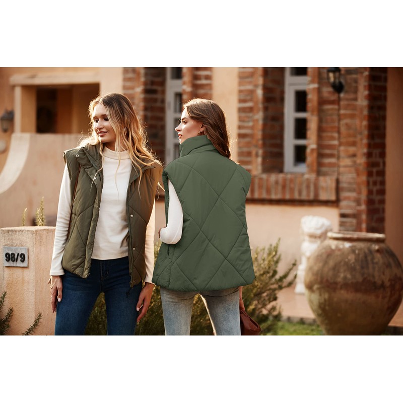 - Feature: Zip front with snap placket, quilted design, sleeveless jacket, stand-up collar, solid color, lightweight, warm and soft, two side pockets, hemline with adjustable drawstrings.