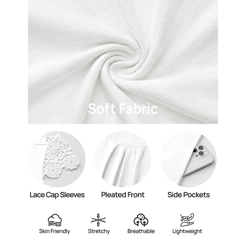 • Features: Sleeveless, pleated front, lace patchwork design, crew neck, two side pockets, solid color, swing a-line silhouette, knee length above, casual loose fit, flowy mini dress, beach cover-up dress, summer trendy dresses for women 2025