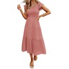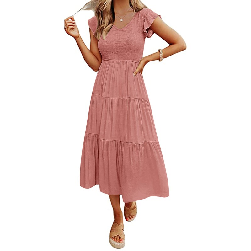 MEROKEETY Women's V Neck Short Sleeve Smocked Dress Flutter Tiered Beach A, Line Midi Dress, Dustypink, XL
