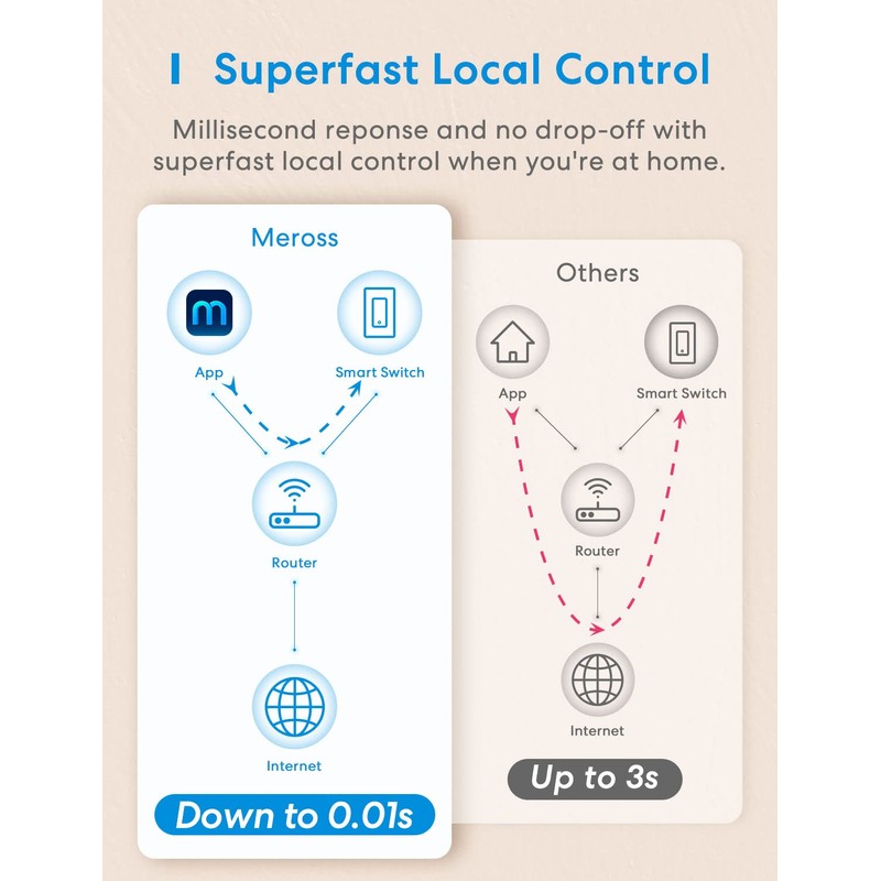 • Voice and Remote Control Light Switch: Control your light from anywhere with internet anytime by smart switch. ONLY supports Meross app. Works with Apple Homekit light switch, Apple Watch, Siri, Alexa, and Google Assistant. You can give simple voice commands to turn on/off the devices that are connected to smart switch light 3 Way. All data is securely transmitted and stored with AWS servers in US