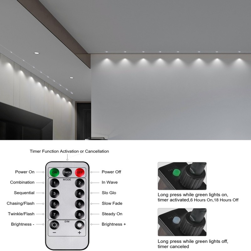 - 8 Lighting Modes & Remote Control: Steady On/In Waves/Sequential/Slo-Glo/Chasing (flash)/Slow Fade/Twinkle(flash)/Combination. Press the button on the controller to change modes. We also can control the Eaves Lights with remote control.