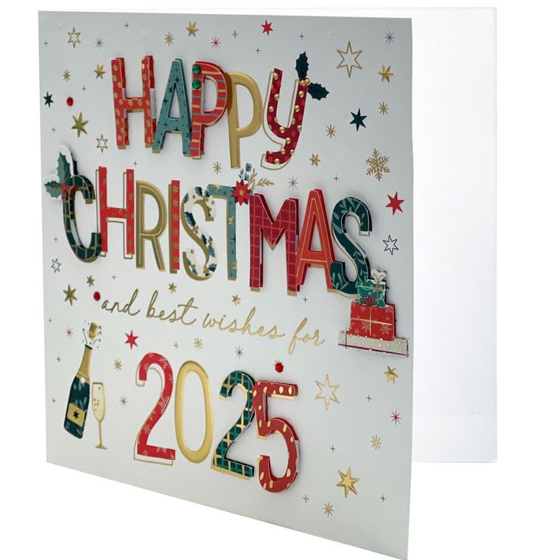 Merry Christmas and Best Wishes for 2025 - Gold Embossed - Embellished - Raised Cut-Out Art - Christmas & Happy New Year Card by Talking Pictures (2025 Best Wishes - Single Card)
