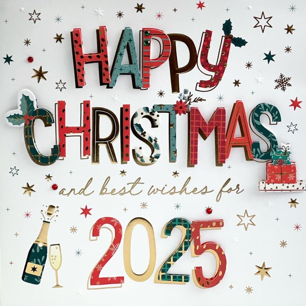 Merry Christmas and Best Wishes for 2025 - Gold Embossed - Embellished - Raised Cut-Out Art - Christmas & Happy New Year Card by Talking Pictures (2025 Best Wishes - Single Card)
