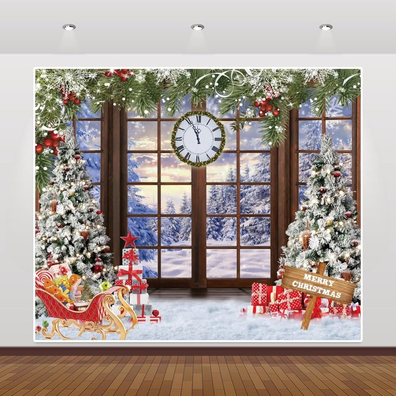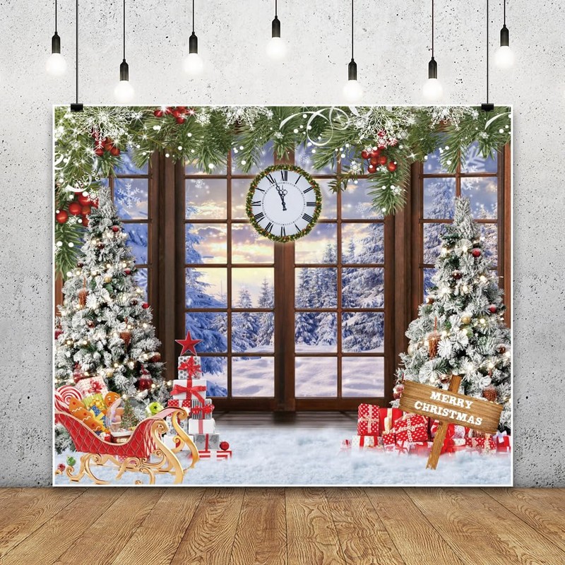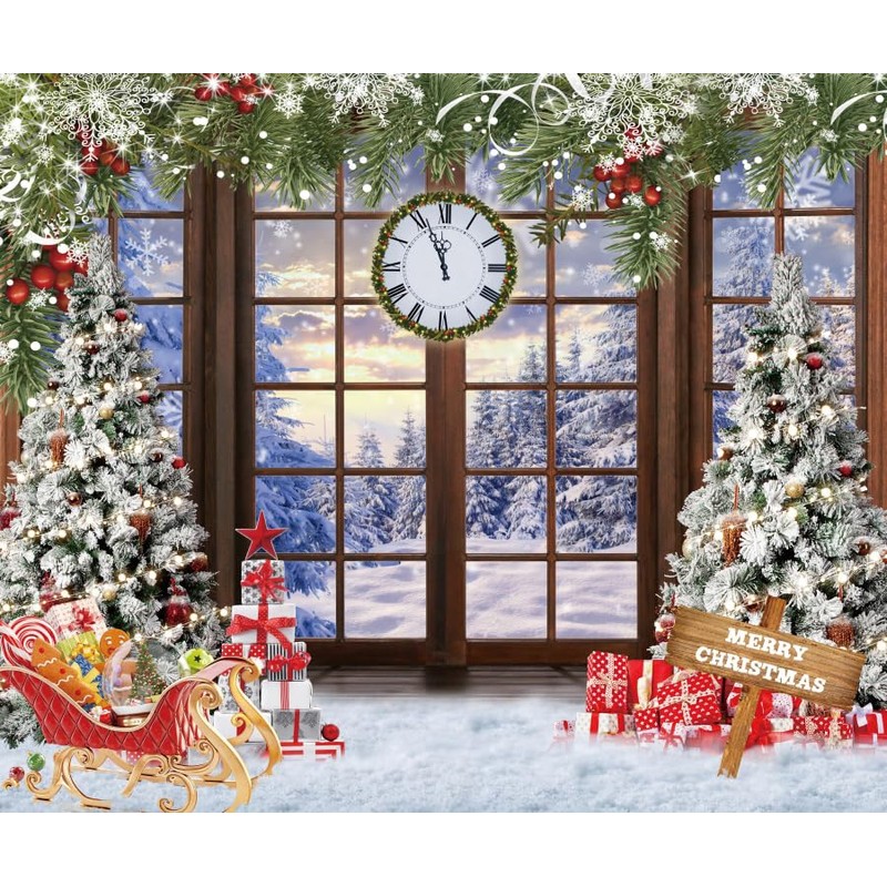 Merry Christmas Backdrops for Photoshoot 10x8ft Window Xmas Clock Winter Snow Forest Christmas Photography Backdrop Xmas Tree Sleigh Gifts Background Holiday Party Backdrop Decor Photo Booth Props