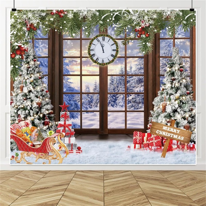 Merry Christmas Backdrops for Photoshoot 10x8ft Window Xmas Clock Winter Snow Forest Christmas Photography Backdrop Xmas Tree Sleigh Gifts Background Holiday Party Backdrop Decor Photo Booth Props