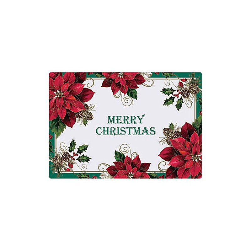 - Spruce up your holiday table setting with these beautiful Merry Christmas Poinsettia paper placemats. Each disposable placemat showcases the phrase "Merry Christmas" in elegant script with a dark green border adorning the edges. Featuring beautiful red poinsettias and holiday greenery, these lightweight placemats will make any table setting elegant and festive.