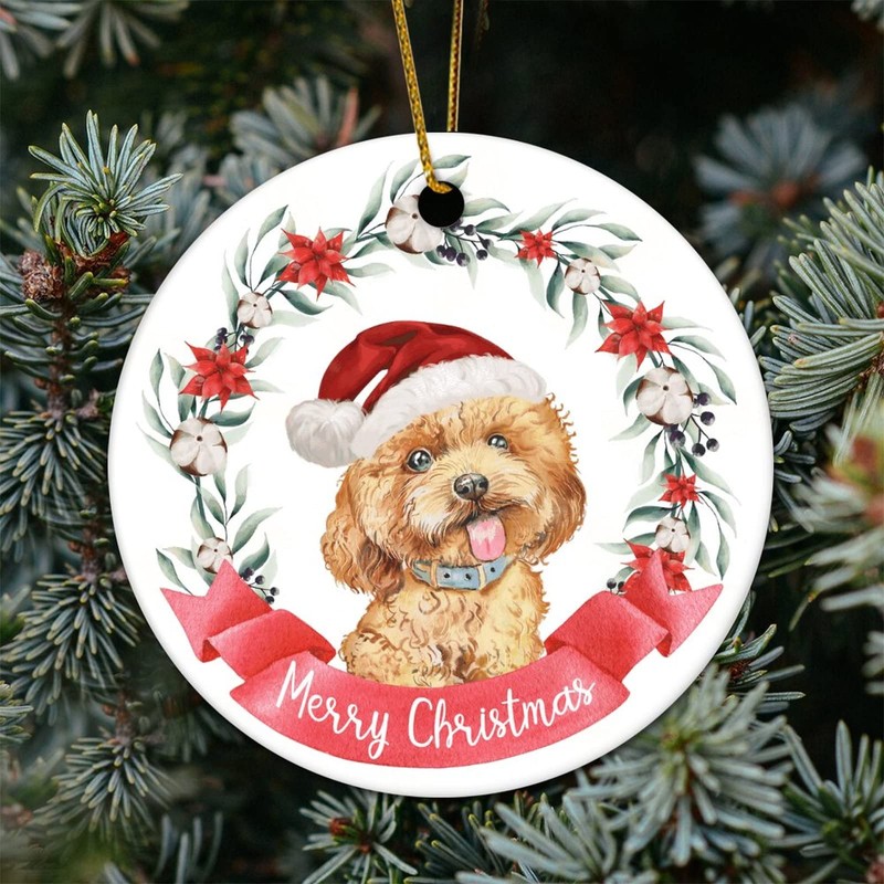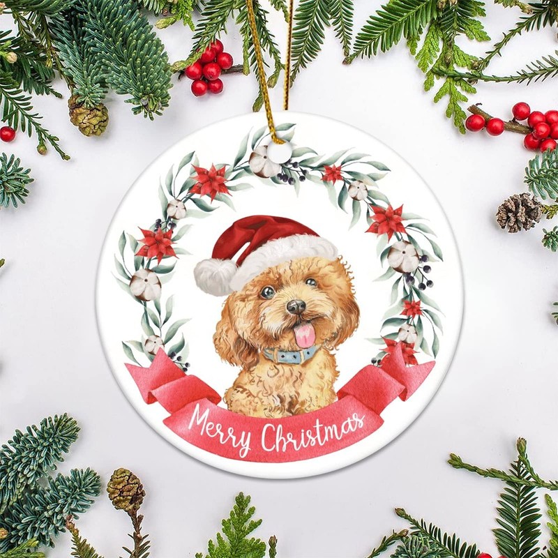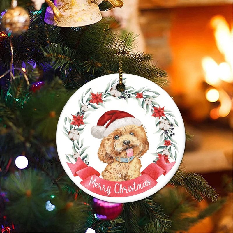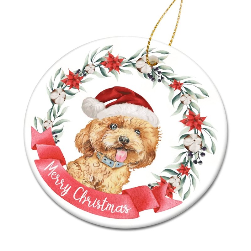 Merry Christmas Wreath Dog Flat Circle Ceramic Ornaments for Christmas Tree Hanging Decoration Novelty Christmas Pendant Bauble Keepsake Holiday Souvenir New Year Xmas Gifts for Kids