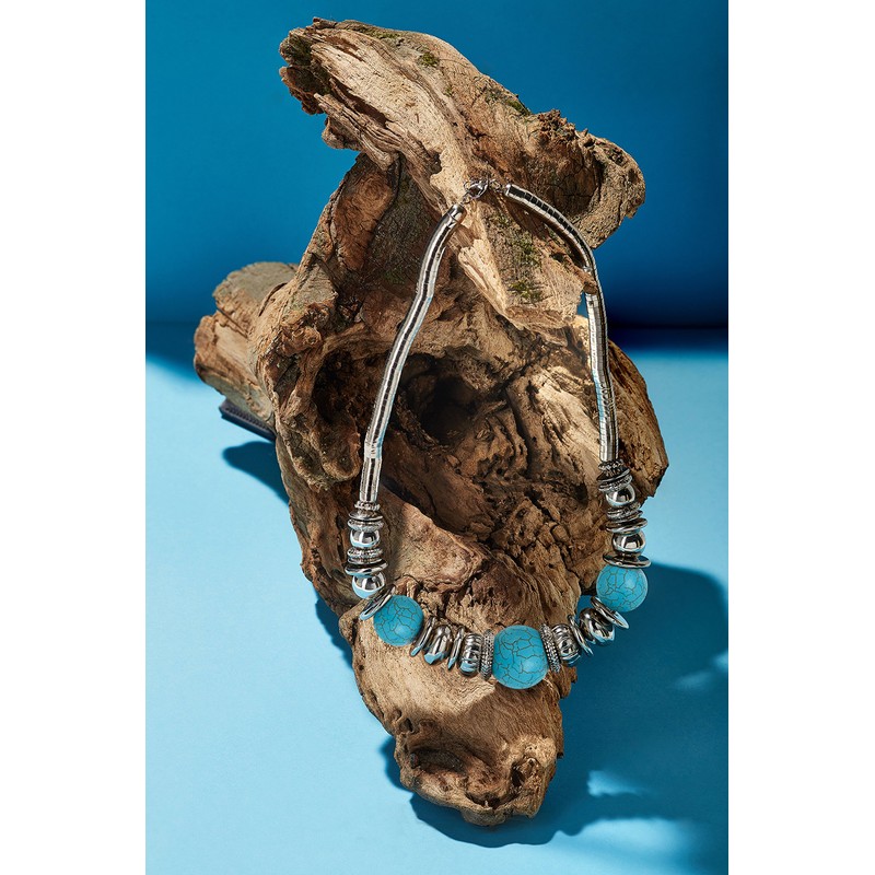- This striking tribal necklace with antique flair consists of the stylish combination of jewellery beads, metallic rings and metal cord. Looks very striking and perfectly complements clothing in boho and ethnic style, but also fits casual and official look.
