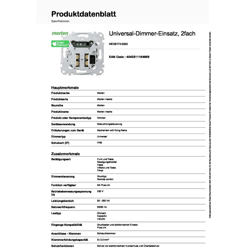 - Specifications: Universal dimmer insert, 2-way, AC 230 V, 50/60 Hz, halogen-free. Protection class: IP20. Contents: 1 piece MEG5172-0000