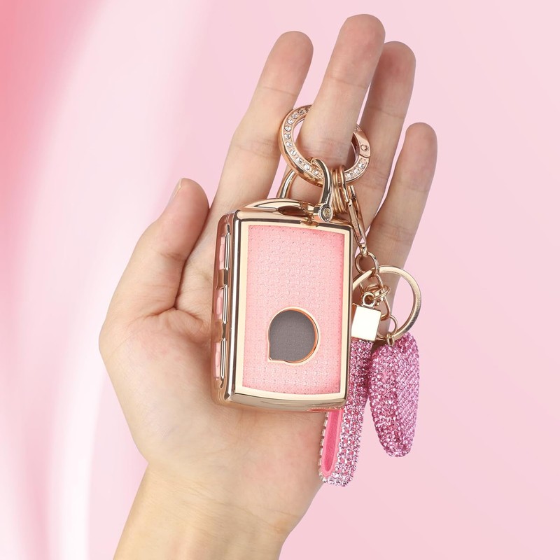 Meruns Compatible with Volvo Key fob Cover with Diamond Bling Keychain, Car Accessories Key Holder Shell for XC40 XC60 XC90 S90 V90 2021 2022 Smart Key, Gold Pink