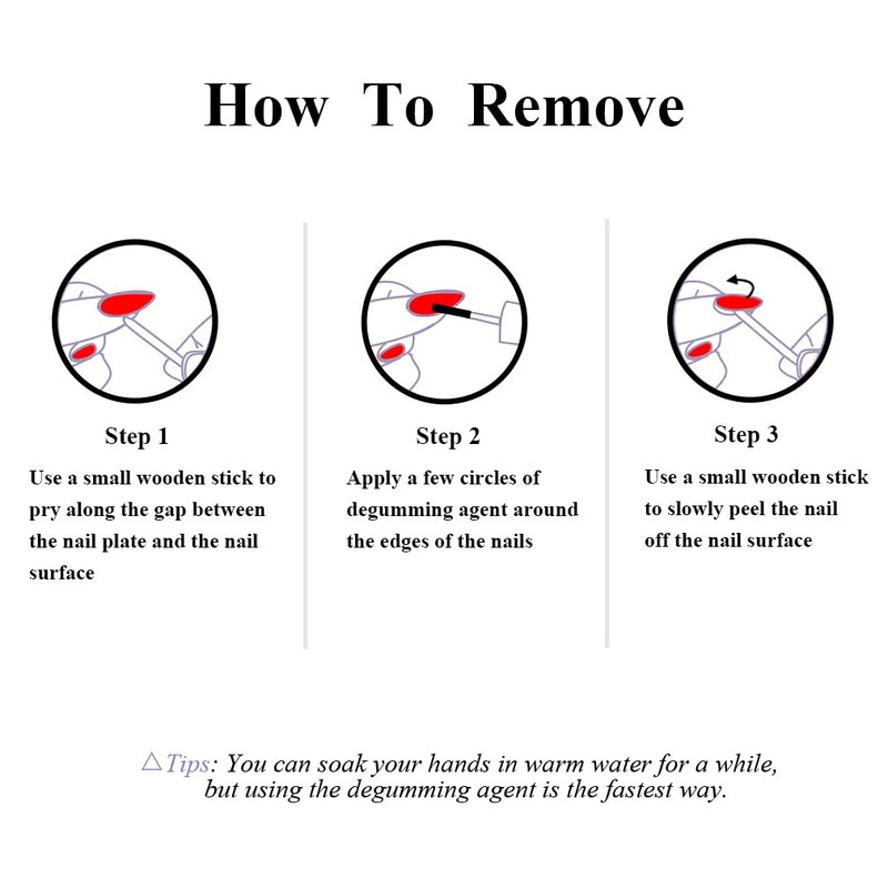 1.Soak your hands in warm water for a while or Apply a few circles of degumming agent around the edges of the nails.