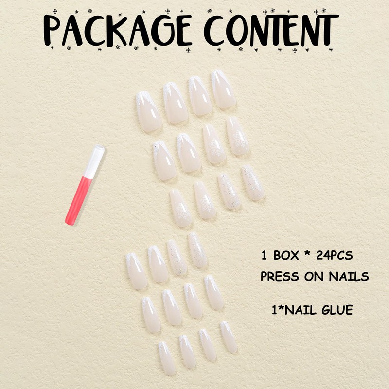 MERVF Christmas Press on Nails Long Coffin Fake Nails White French Tip Squoval Glue on Nails with Snowflake Design Glitter Acrylic Nails 24pcs Glossy False Nails