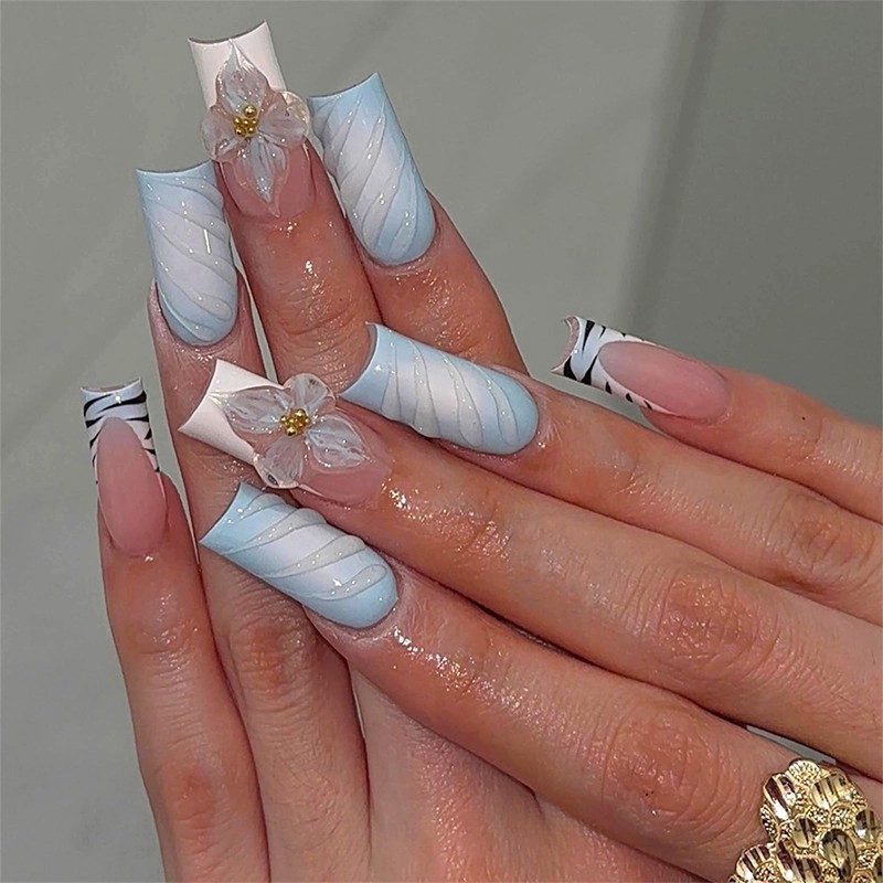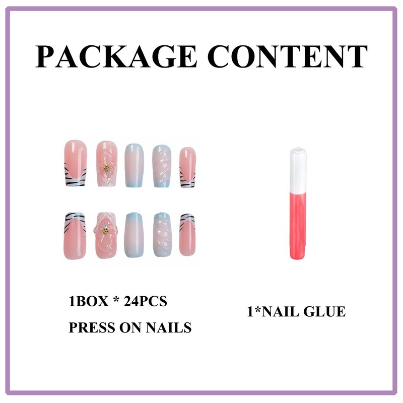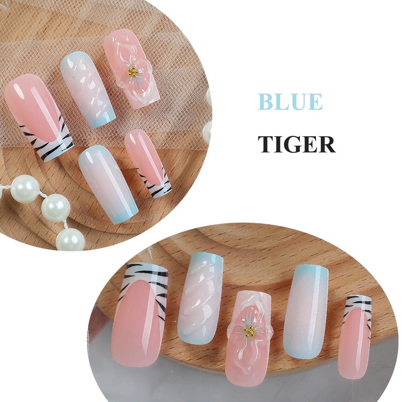 MERVF Long Press on Nails Square Fake Nails Blue Ombre French Tip Glue ons Squoval Tiger Print Summer Acrylic Nail Manicure Supplies 3D Flower Design Art DIY Glossy 24pcs