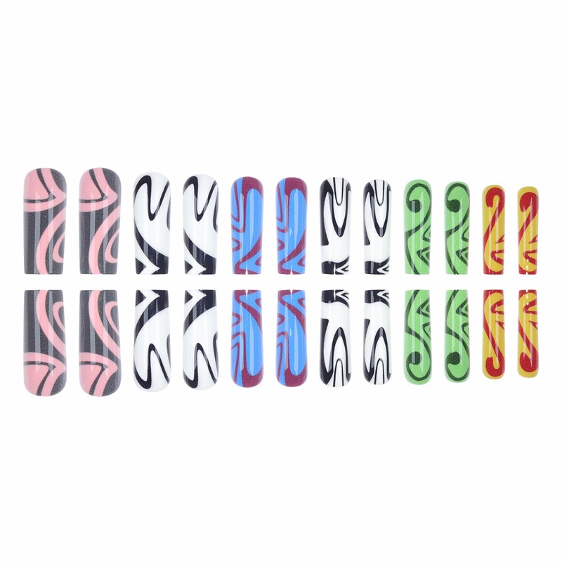 MERVF Long Square Press on Nails Colorful Fake Nails Press ons Graffiti Glue on Nails with Striped Design Squoval Gothic Cool Acrylic False Nails Glossy 24pcs