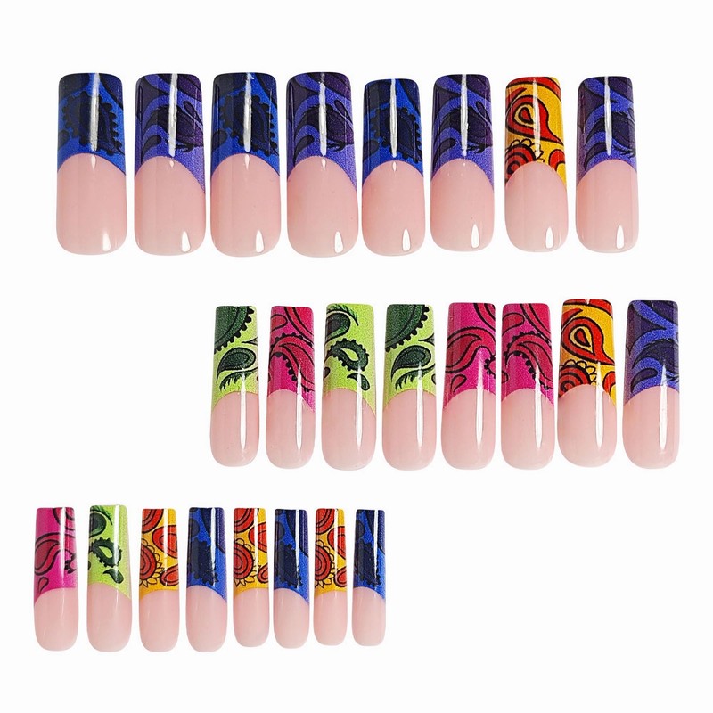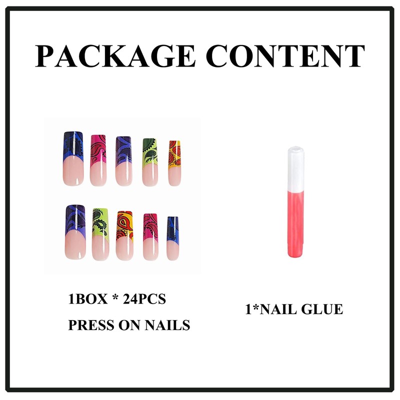MERVF Long Square Press on Nails Colorful French Tip Fake Nails Goth Glue ons Squoval Weird Print Acrylic Nail Gyaru Manicure Supplies Art DIY Glossy 24pcs