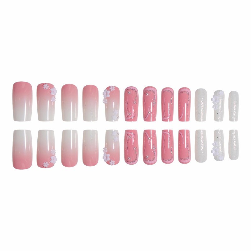 MERVF Long Square Press on Nails Flower Fake Nails Press ons Ombre White French Tip Glue on Nails with 3D Design Squoval Pink Acrylic False Nails Glossy 24pcs