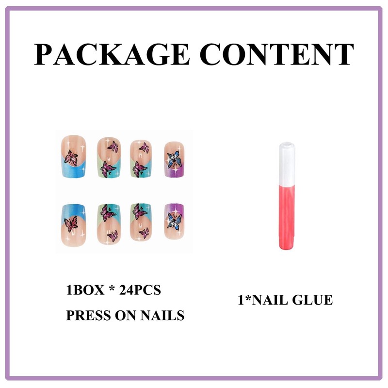 MERVF Square Press on Nails Medium Fake Nails Colorful Ombre French Tip Glue ons Butterfly Design Squoval Dopamine Acrylic False Nails 24pcs Glossy