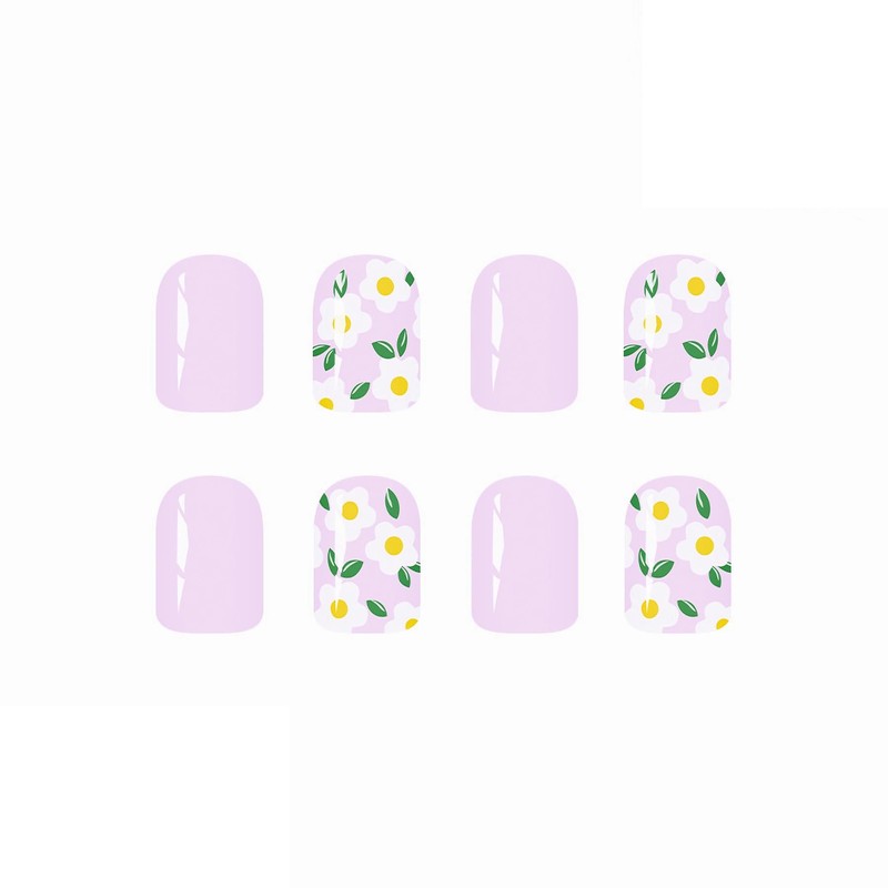 MERVF Square Press on Nails Short Fake Nail Light Purple Solid Color Glue ons Daisy Flower Design Acrylic Nails Summer Squoval Manicure 24pcs Glossy