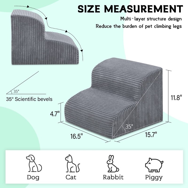 - 【Multiple Stairs Size to Choose】TWO-STEP: 15.7"L*16.5"W*11.8"H, THREE-STEP: 23.5"L*16"W*16"H, FOUR-STEP: 28"L*15"W*20"H. It's a dog stair for most high beds, couch and sofa.