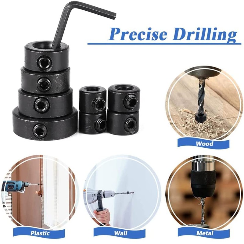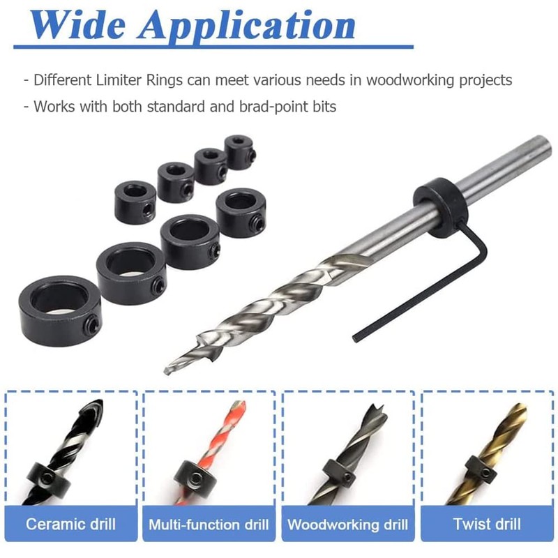 - Drill Depth Stop Collar Set: Mainly used for fixed limit drilling depth on the drill bit, help you drill the depth accurately. Setscrew-type collar will not damage bits.