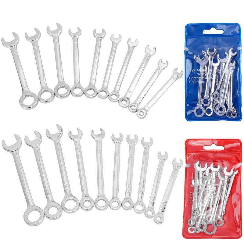- 2-set ring spanner set: 10 pieces SAE size: 5/32 inch, 3/16 inch, 13/64 inch, 7/32 inch, 15/64 inch, 1/4 inch, 9/32 inch, 5/16 inch, 3/8 inch, 7/16 inch; 10 pcs metric size: 4 mm, 4.5 mm, 5.5 mm, 6 mm, 7 mm, 8 mm, 9 mm, 10 mm, 11 mm.