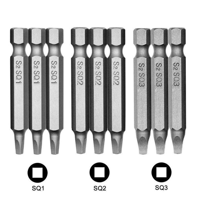 - Square Screwdriver Bit Set in 3 Different size: SQ1 SQ2 SQ3, 3pcs each size, total 9 pieces.