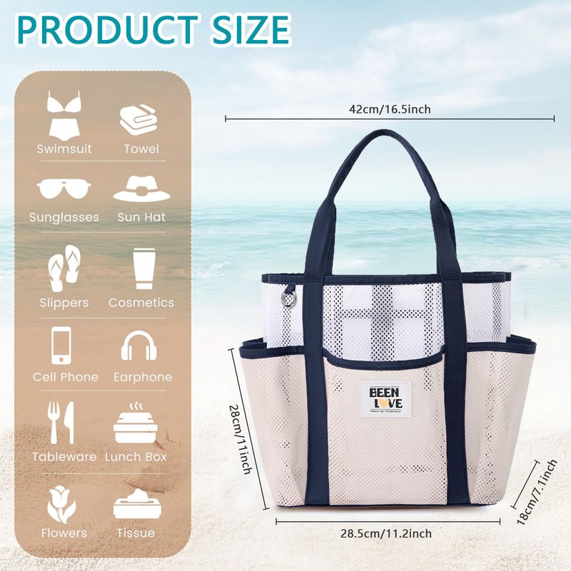 - LARGE MESH BEACH BAG: This mesh beach bag features a generous 28.5*18*28cm size, offering ample space for all your beach essentials. With eight strategically placed pockets, including one large built-in compartment and a dedicated phone sleeve, you can effortlessly organize towels, sunscreen, sunglasses, and more. The six exterior pockets provide quick access to smaller items like keys or snacks, ensuring everything stays secure and within reach during your seaside adventures.