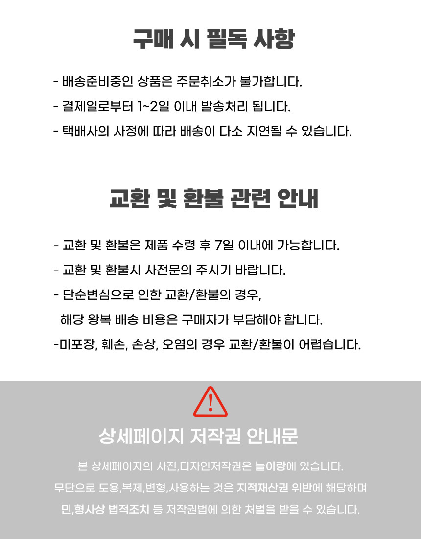 본 제품을 구매하시면 원활한 배송을 위해 꼭 필요한 고객님의 개인정보를 (성함, 주소, 전화번호 등) 택배사 및 제 3업체에서 이용하는 것에 동의하시는 것으로 간주됩니다.
