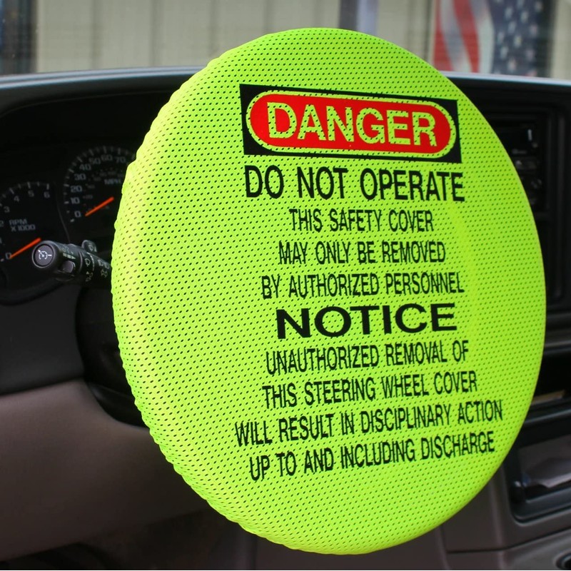 Mesh Steering Wheel Cover Unlike vinyl covers, this cover can be folded and kept in a glove compartment or even in your pocket. It can also be washed. Can come with or without a pocket. The cover is made of a 6 oz open weave ANSI compliant fluorescent orange polyester fabric, that is both durable and florescent. Will not lose its shape due to washing. 22" Cover Manufactured in the USA 22" Cover DANGER DO NOT OPERATE THIS SAFETY COVER MAY ONLY BE REMOVED BY AUTHORIZED PERSONNEL NOTICE UNAUTHORIZED REMOVAL OF THIS STEERING WHEEL COVER WILL RESULT IN DISCIPLINARY ACTION UP TO AND INCLUDING DISCHARGE Product designed by Cassy Weeks
