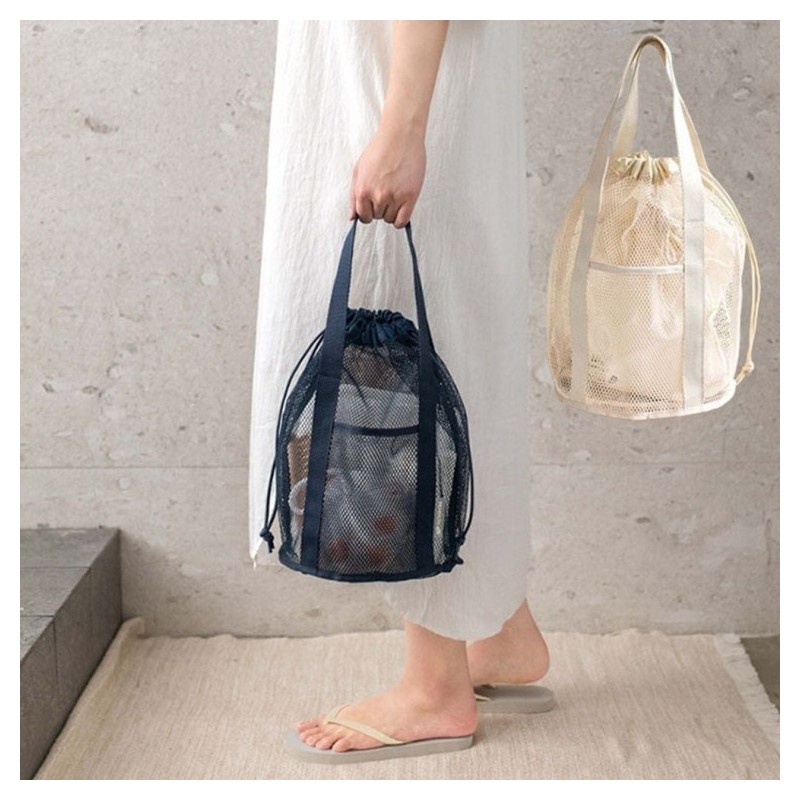 Mesh Swim Storage Bag Beach Travel Tote with Drawstring Pockets Mesh Beige
