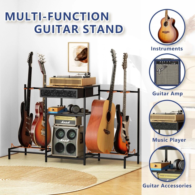 Enough Storage Space&Capacity: This multi-function guitar stand has a 3-tier storage rack with drawer. The 3 layers shelf has enough space to help you keep guitar amp, vinyl record players, records, albums, sheet music, magazines and so on. Meanwhile, the drawer also can store your guitar & bass accessories, such as guitar tuners, straps, strings, capos, repair kits and other small items, which help you use the vertical space more efficiently, keeping your collection organized.