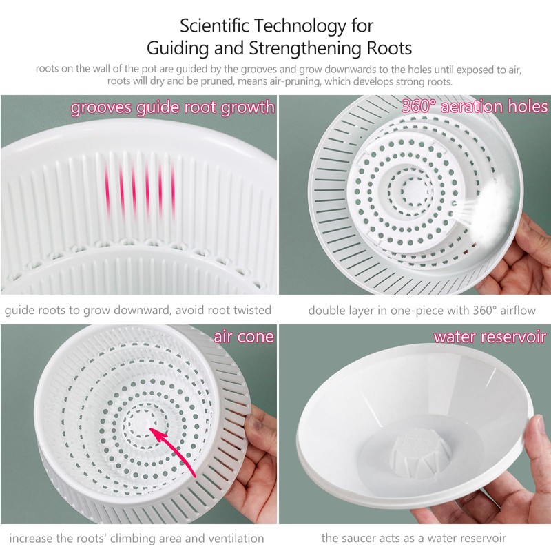 - Scientific Technology for Controlling and Strengthening Roots: Roots on the wall of the pot are guided by the grooves and grow downwards to the holes until exposed to air, roots will dry and be pruned, means air-pruning, which develops strong roots.