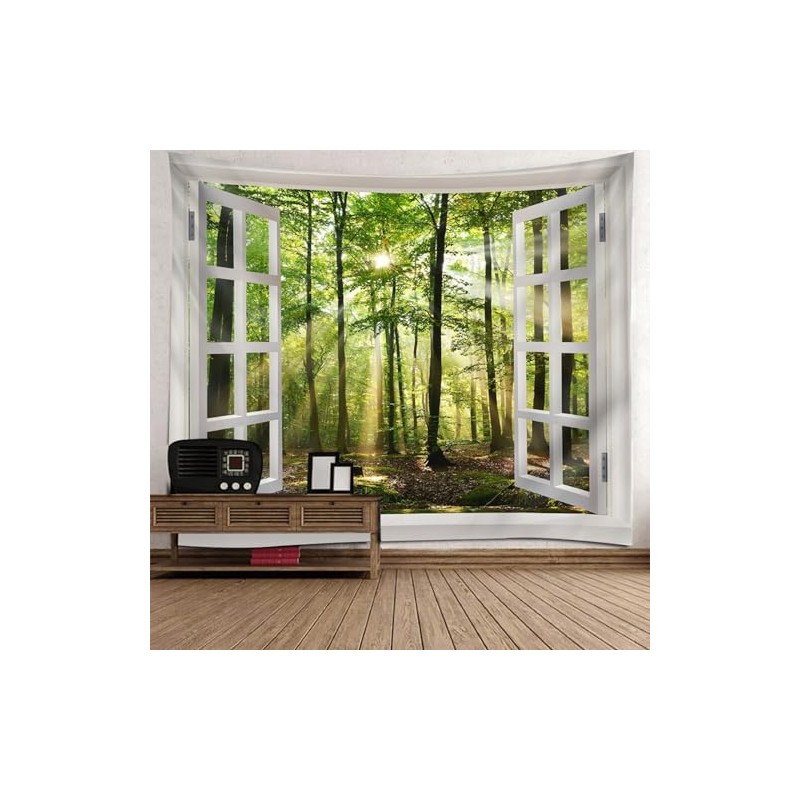 Mesnt Tapestry Nature Forest, White Window with Natural Forest Landscape Outdoor Tapestries Wall Art for Bedroom Living Room, 240 x 220 cm