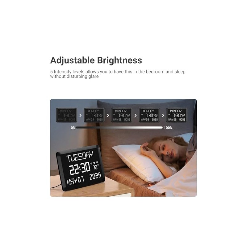 - 11.5" Extra Large Display--Show The Time Clearly: With 11.5 inch extra-large screen, big bright white LED letters and numbers show clearly on the dark background of this digital wall clock, you will see the time, date and temperature from all direction in your room, no more worrying about the elderly or people with poor vision can't see them clearly. 5 levels of adjustable brightness let you turn it down to look softer at dark night