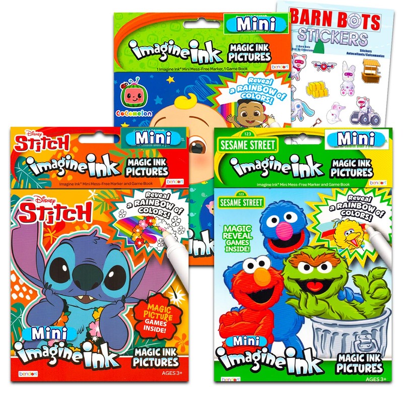 - Includes: 1 Cocomelon Imagine Ink coloring book, 1 Sesame Street Imagine Ink coloring book, and 1 Lilo and Stitch Imagine Ink coloring book.