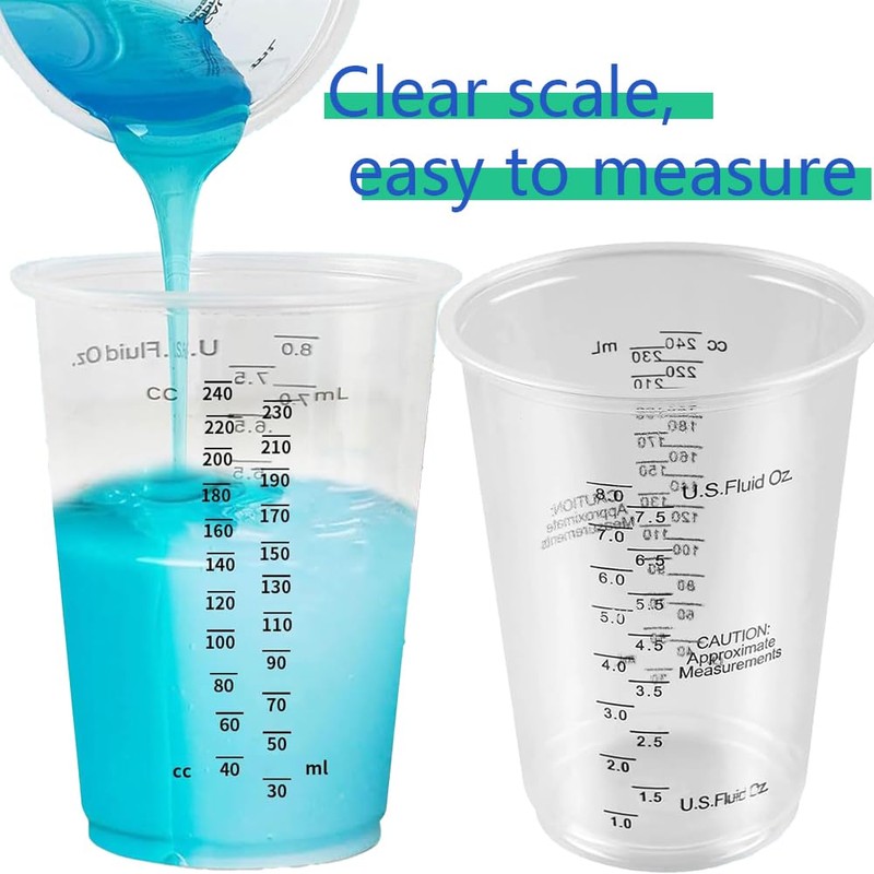 - Präzise Skala: Der Becher verfügt über klare Skalen, mit denen Sie den Anteil von Harz, Härter oder Pigment einfach und genau messen können, um ein genaues Mischungsverhältnis sicherzustellen.