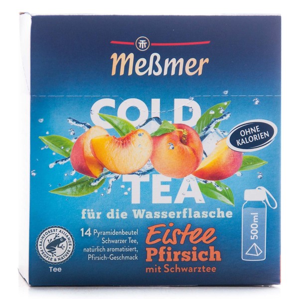 Erleben Sie Eistee-Pfirsich von Meßmer COLD TEA – die erfrischende und genussvolle Art, den Körper mit Flüssigkeit zu versorgen. Feiner Schwarztee, kombiniert mit dem fruchtig-süßen Geschmack nach saftigen Pfirsichen. Meßmer COLD TEA ist ein schnell zubereiteter Schwarztee, denn Sie benötigen lediglich den Meßmer-Pyramidenbeutel und kaltes Wasser. Genießen Sie sommerliches Tee-Feeling zu Hause oder als Durstlöscher unterwegs.