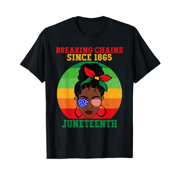 • Stunning design of a brown woman a large messy Afro bun, red, yellow, and green Juneteenth bandana, in flag USA sunglasses. Perfect gift item to celebrate equality Emancipation Day, Freedom Day, Black History Month. Breaking chains since 1865.
