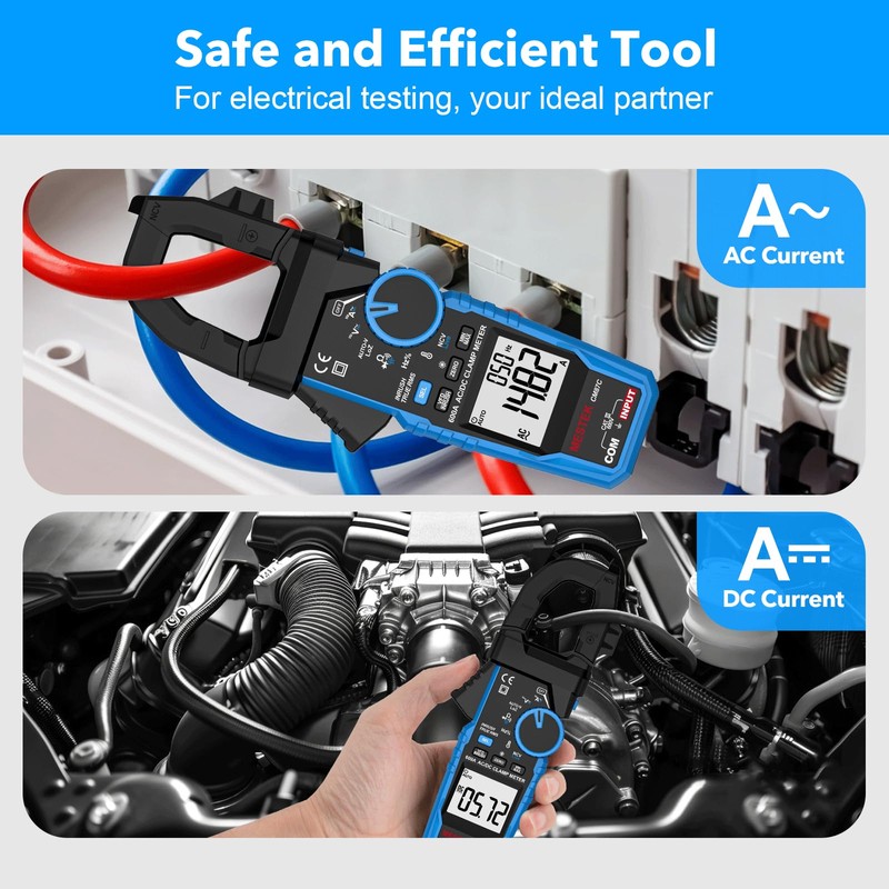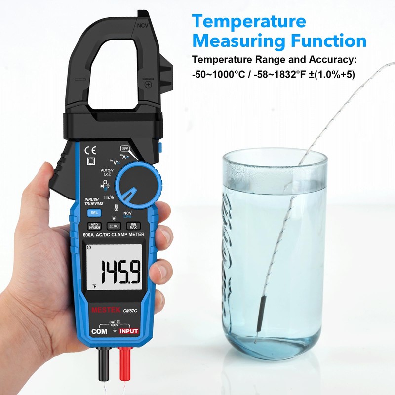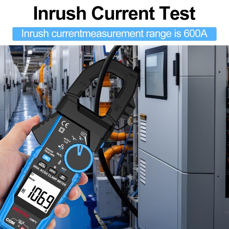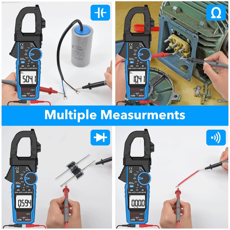 - 【6000 Counts Clamp Meter】MESTEK CM87C digital clamp meter, True-RMS 6000 counts, max current 600 A, accurate measurement of AC/DC current, AC/DC voltage, inrush, capacitance, resistance, continuity, diode, frequency, temperature, and supports NCV, live wire detection, A useful troubleshooting tool that will help you solve electrical problems in the car, industrial or at home quickly and safely, perfect for electricians, DIY, professionals, etc