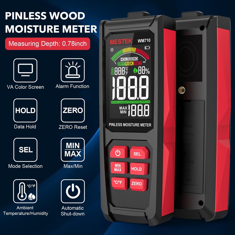- PINLESS MOISTURE METER - The WM710 moisture meter is 100% non-destructive induction design, which transmits and receives high-frequency electromagnetic wave signals from measured materials through the reverse sensor. The Maximum measuring depth can be up to 4/3 inch (20mm), the digital moisture meter also ensures high-accuracy measurement, whether you're working with drywall, masonry, softwood, or hardwood, you can get clear and precise moisture readings on the color LCD screen.