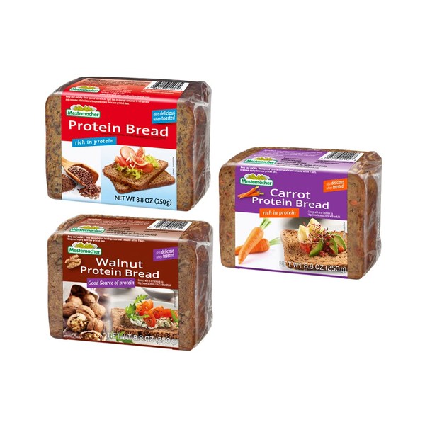 Mestemacher Protein Bread 8.8 ounces, Variety Pack of 3 - Protein (1), Walnut (1), Carrot (1)
