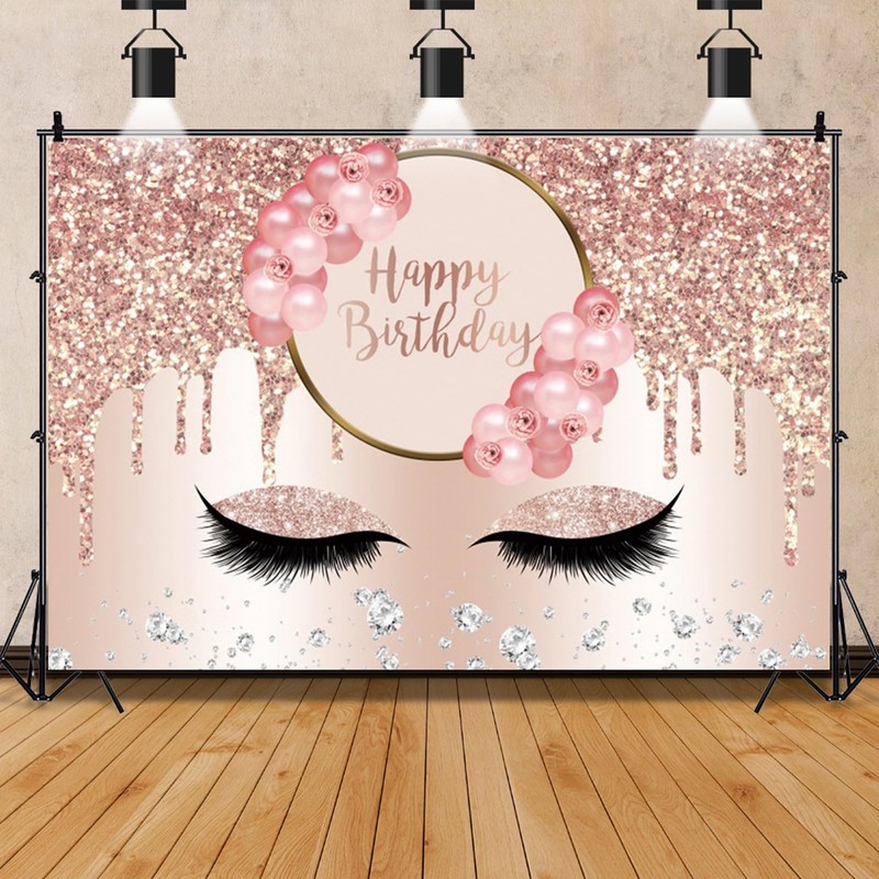 Mestiker 7x5ft Rose Gold Happy Birthday Banner Backdrop Pink Cream Nice Eyelashes Happy Birthday Backdrop for Women Pink 40th 50th Background Photo Booth Decor