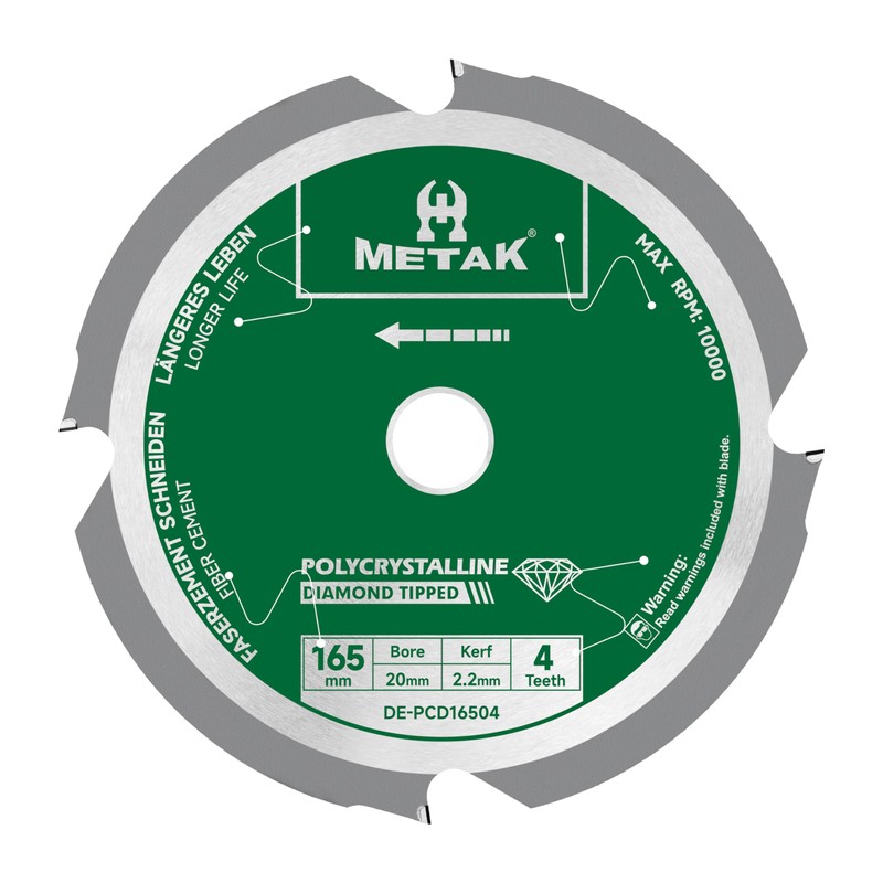 - Special saw blade – the METAK circular saw blade (165 x 20 mm) with 4 diamond teeth (PCD) is your specialist for precise cuts in fibre cement and eternite. Perfect for interior design and roofing, it makes any job easier with its long-lasting sharpness.
