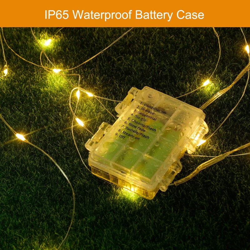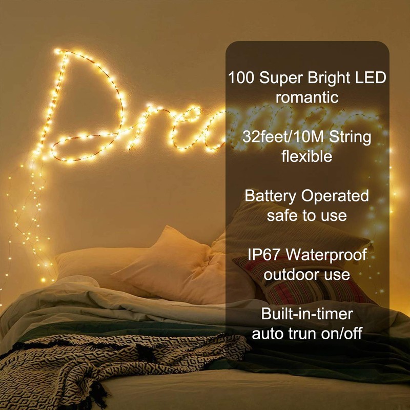 - đăOUTDOOR/INDOOR HOLIDAY HANG LIGHTSă The entire lights is waterproof and can be used safely at outdoors and there is a hook on the battery case that could easily hang the lights. With 100 super bright, warm white LED lights, these string fairy lights create a brilliant, magical atmosphere, adds ambiance to any events like party, Halloween, wedding, Christmas. Nice idea for your patio, porch, yard, garden, bedroom, fireplace, curtain, ceiling, wall ect.