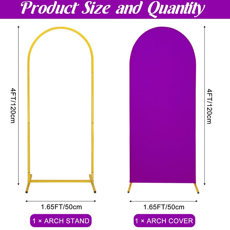 Metal Arch Stand and Cover Set,1 Purple Spandex Fitted Backdrop with 1 Gold Wedding Arched Stand Frame for Parties Birthday Baby Shower Bridal Banquet Decoration (4FT)