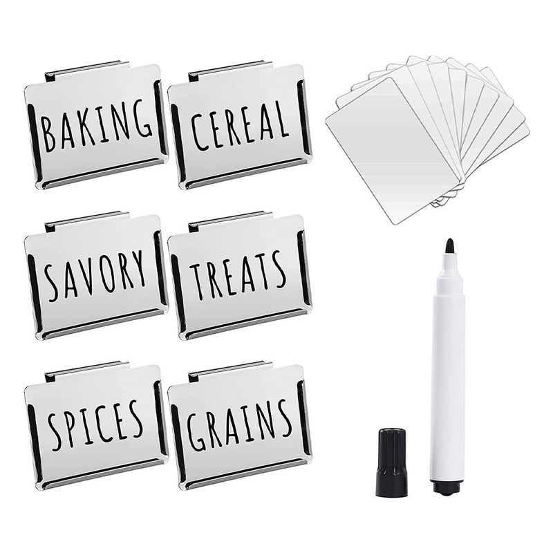- 2.SET INCLUDES: 6 white metal clip on label holders (3 1/2'' x 2 1/2" each), 20 White cards (3 1/2'' x 2 1/5" each) and 1 wet-erase black marker.