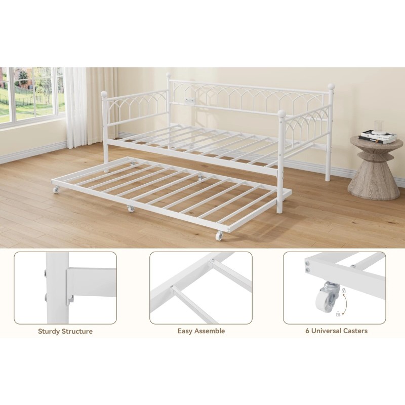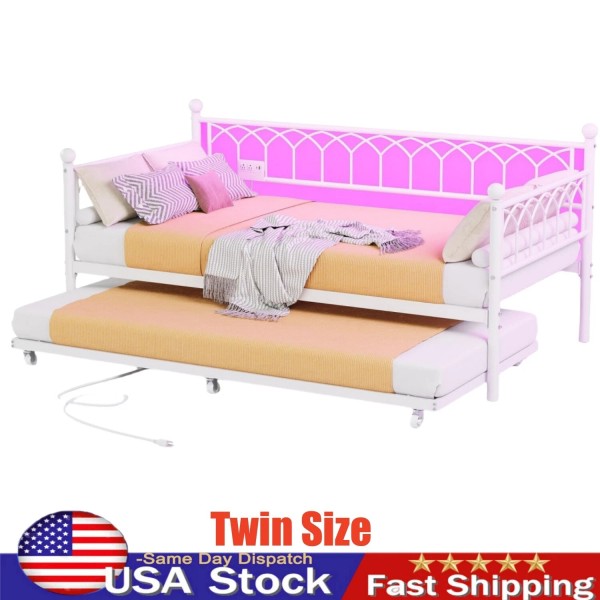 Metal Daybed Pull-out Trundle Twin Size Day Bed Frame w/ Charging Station LED