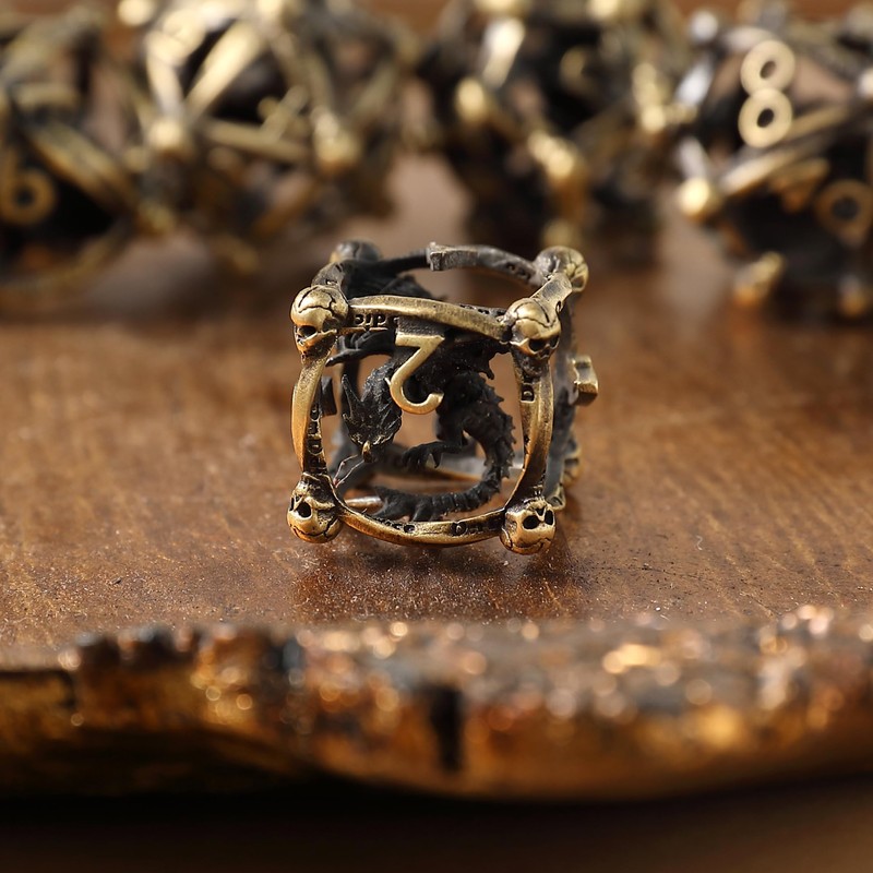 - Metal cube set: a set of polyhedral cubes with a total of 7 pieces, including D4, D6, D8, D10, D12, D20 and D%. They have a skeletonized design with an intricate 3D dragon/skull on the cube that is eye-catching and well made. The numbers are clearly legible and the skeletonized design is amazingly effective and definitely an eye-catcher on the table.